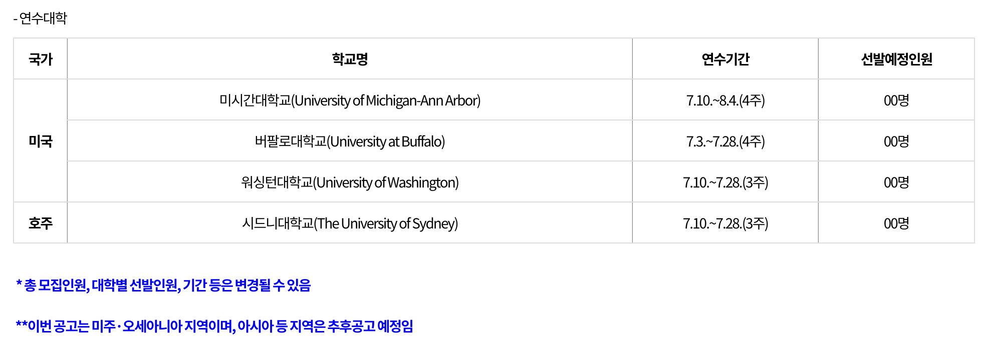 요구 비자 ESTA, J1 등 대학별로 상이하며 추후 공지 예정입니다.