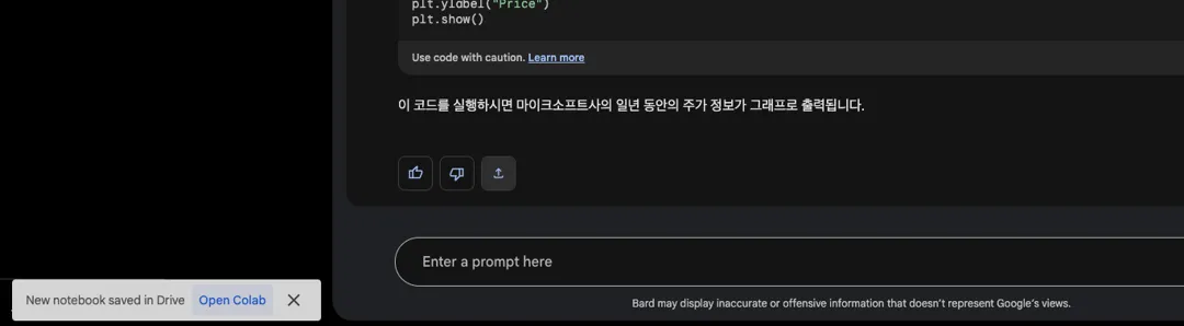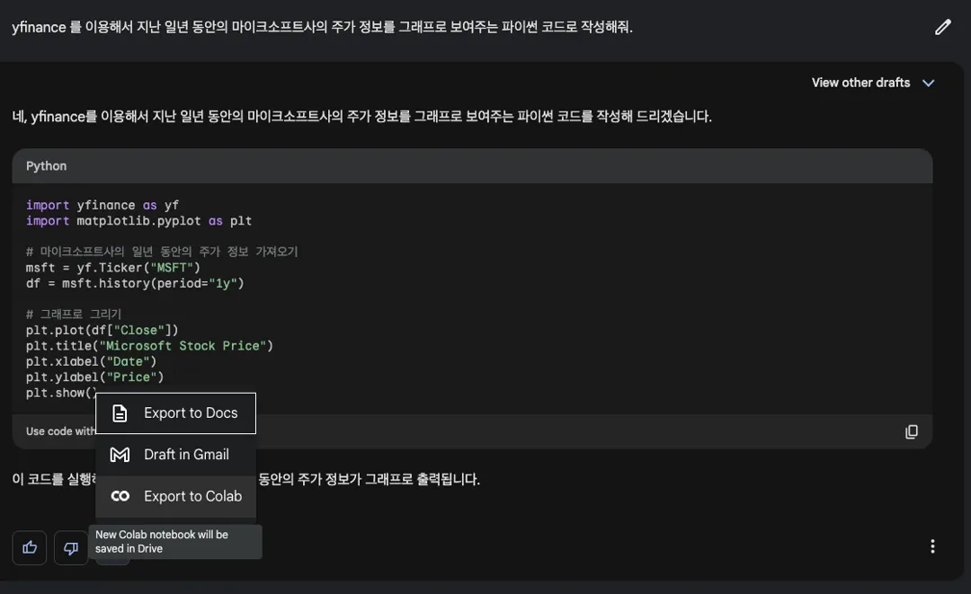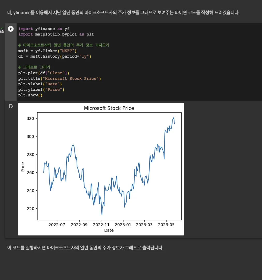 마이크로소프트사의 지난 일 년 동안의 주가 정보를 가져와서 그래프로 보여주는 파이썬 코드를 작성해 달라고 바드에 요청했습니다.