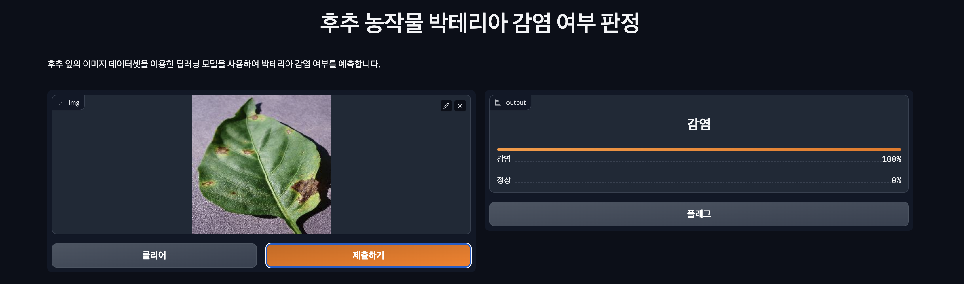 아래는 미리 만들어둔 후추 잎의 감염 여부를 판정하는 웹 어플리케이션입니다. gradio 라는 툴을 이용하면 편리하게  아래와 같은 web application 제작이 가능합니다.
