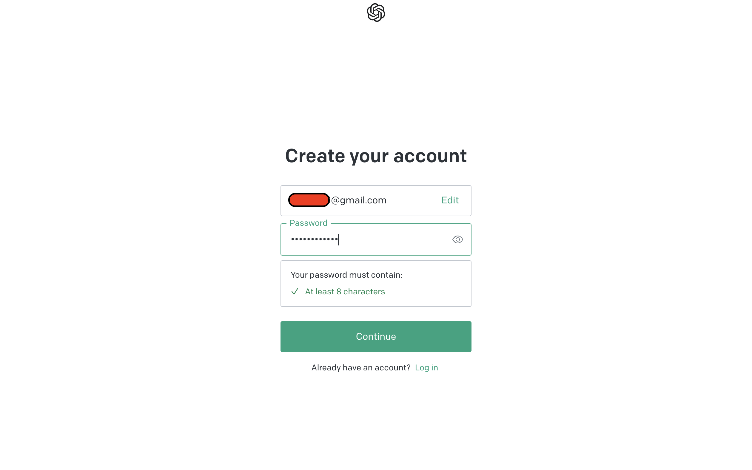 이메일 주소를 입력하고 사용할 비밀번호를 입력합니다. 비밀번호는 최소 8글자 이상이어야 합니다. 안전을 위해 특수 문자를 섞어서 만들어 주세요. 입력 후 녹색 Continue 버튼을 누릅니다.