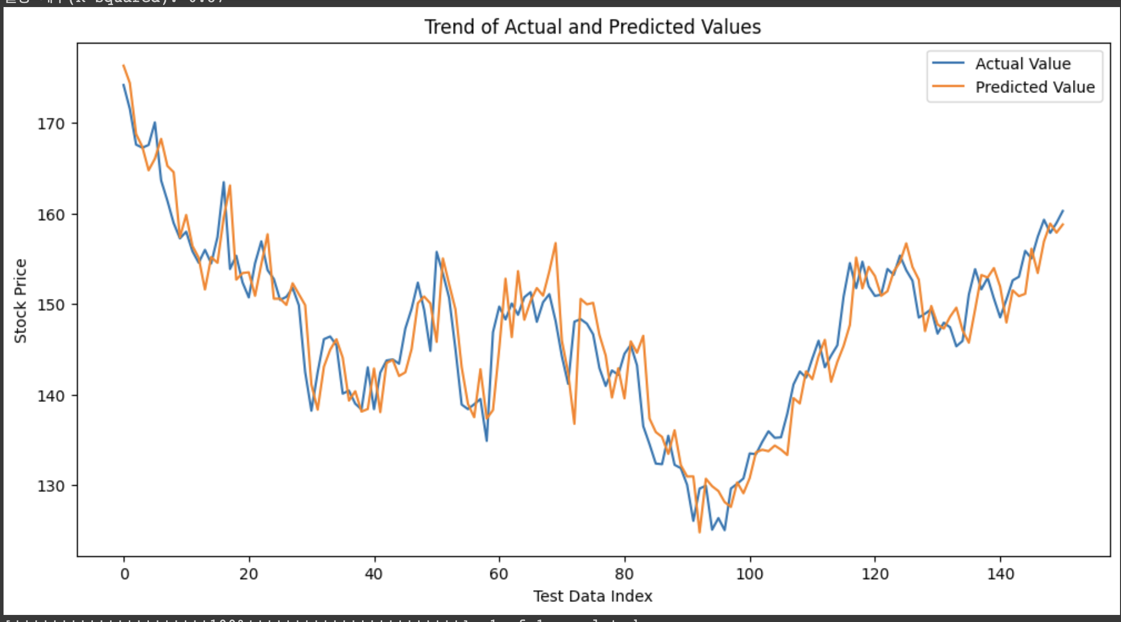위 코드를 실행하면 테스트 데이터에 대한 평균 제곱 오차(MSE)와 결정 계수(R-squared)가 출력됩니다. 이를 통해 모델의 성능을 평가할 수 있습니다. 추가적으로, 실제 값과 예측 값의 추세를 그래프로 시각화하여 모델의 성능을 직관적으로 확인할 수 있습니다.